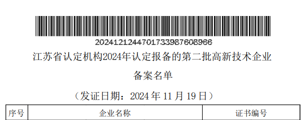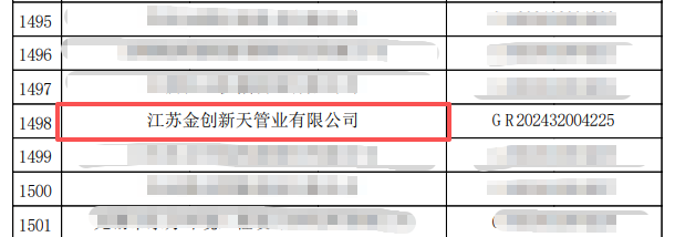 近日,高企认定官网发布公告,江苏金创新天管业有限公司成功入选江苏省认定机构2024年认定报备的第二批高新技术企业名单,证书编号GR202432004225,发证日期为2024年12月12日。这一荣誉的获得,标志着金创新天管业在技术创新、研发投入及成果转化等方面得到了权威认可,也为公司未来的高质量发展注入了强大动力。